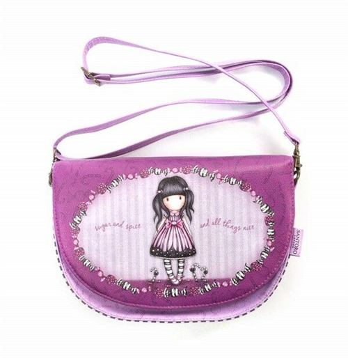 Tracolla Gorjuss Sugar and Spice – Santoro. In ecopelle, colore viola e rosa, tracolla regolabile, tasca interna chiusa da cerniera. Ideale da passeggio e come idea regalo.