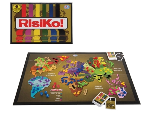 Editrice Giochi RisiKo!. Genere: Strategia, Pubblico di destinazione: Bambini e Adulti, Genere consigliato: Ragazzo/Ragazza. Contenuto della scatola: 6 armate colorate composte da carrarmatini e bandierine, 3 dadi blu, 3 dadi rossi, un mazzo di... In Italia RisiKo! è sinonimo di Strategia! E con il time attack decidi tu la durata della partita! Oltre alle regole tradizionali troverete anche quelle "da Torneo" e la lista completa dei Club RisiKo! in Italia. Da 3 a 6 giocatori. Gioco da tavolo sinonimo di strategia Con variante di gioco "Time Attack" per fissare la durata della partita Regole "da Torneo" e lista dei Club Risiko! Incluse La confezione contiene: 6 armate colorate composte da carrarmatini e bandierine, 3 dadi blu, 3 dadi rossi, un mazzo di carte ed una plancia di gioco raffigurante il mondo. Da 3 a 6 giocatori. Scheda Tecnica: CARATTERISTICHE Genere - Strategia. Modalità giocatore singolo - No. Modalità multiplayer - Sì. Numero minimo di giocatori 3 Numero massimo di giocatori 6 Pubblico di destinazione - Bambini e Adulti. Genere consigliato - Ragazzo/Ragazza. Età consigliata (min) - 10 anno/i. Adatto per Interno. CONTENUTO DELL'IMBALLO Tavolo da gioco incluso - Sì. Contenuto della scatola - 6 armate colorate composte da carrarmatini e bandierine, 3 dadi blu, 3 dadi rossi, un mazzo di carte ed una plancia di gioco raffigurante il mondo.