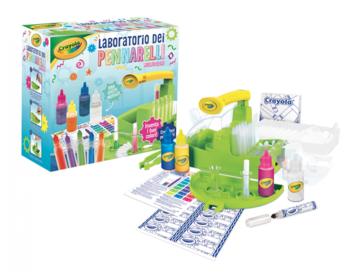 Laboratorio dei Pennarelli Multicolore Un vero laboratorio di creatività per creare fino a 16 pennarelli personalizzati e inventare le proprie sfumature di colore. E' semplice e divertente, i bambini si caleranno nei panni di piccoli inventori. Include il nuovo inchiostro bianco per creare ancora più totalità di colore. Contenuto: 1 unità Laboratorio dei Pennarelli 4 boccette d'inchiostro da 29 ml. cad, (rosso, giallo, blu e bianco) 16 set per creare pennarelli (16 punte coniche, fusti, filtri, cappucci) 2 provette per misurare l'inchiostro 2 astucci da 12 pennarelli 1 foglio di adesivi 2 fogli di etichette 1 pinzetta 1 guida per la creazione dei colori Dimensione: 30 x 14 x 30 cm.