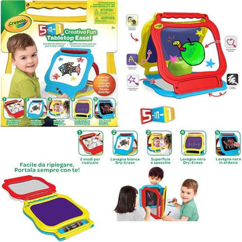 Banchetto da tavolo 5 in 1 - Crayola Innovativa invenzione con 5 tipi di superficie in una unica soluzione: lato per tracciare, lavagnetta bianca, laagnetta nera, lavagnetta per gessi, lato a specchio. Si ripiega facilmente ed è portatile Contenuto: 1 banchetto 5 in 1 1 pastello a cera dry-erase Crayola Dimensione: 28 x 4 x 32,5 cm.