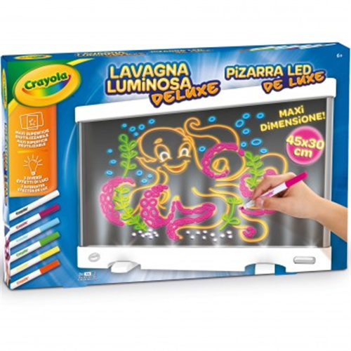Lavagna luminosa Deluxe Super lavagna luminosa che permette di trasformare i disegni in modo unico e splendente! Non occorre fare altro che disegnare, scrivere, colorare sulla maxi superficie riutilizzabile con i Mini pennarelli gel FX inclusi, accendere la lavagna e osservare il disegno illuminarsi. Le luci LED inserite nella cornice della lavagnetta faranno brillare e splendere i capolavori! Il pannello all'interno è removibile e l'unità diventa così ideale per ricalcare immagini, foto, scenette. Si può anche usare per illuminare la cameretta Contenuto: Unità lavagna luminosa con pannello rimovibile 6 mini pennarelli gelfx Dimensione scatola: 46 x 5 x 30 cm.