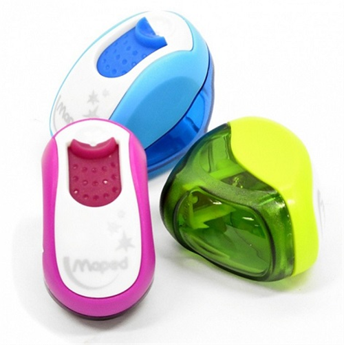Temperamatite a un foro con contenitore.Sistema di protezione del foro con apertura a scorrimento e chiusura automatica.