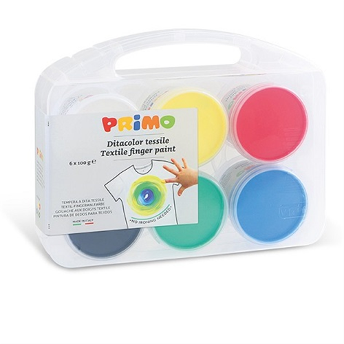 Tempera a dita tessile in vasetto, pronta all’uso, in pratica valigetta riutilizzabile, 6 colori. Adatta al contatto con la pelle è rivolta alla prima infanzia ed è espressamente studiata per essere applicata con le dita su tessuti. Morbida e piacevole da toccare, è facile da stendere. Quando è perfettamente asciutta rimane di colore intenso, senza screpolature anche se stesa in strati spessi e diviene permanente. Durante l'utilizzo si raccomanda di proteggere gli abiti e la superficie di lavoro. Non necessita di fissaggio ma deve essere lasciato asciugare perfettamente per almeno 24 ore a temperature tra i 18 e i 25 °C. Se si vuole stirare appoggiare la parte colorata sopra una carta da forno e stirare dal rovescio avendo cura di appoggiare sul rovescio uno straccio in modo da evitare di sporcare il ferro da stiro. Una volta asciutto non è lavabile dai tessuti. Resistente al lavaggio a 30°. Rimuovere immediatamente eventuali macchie indesiderate secondo istruzioni.