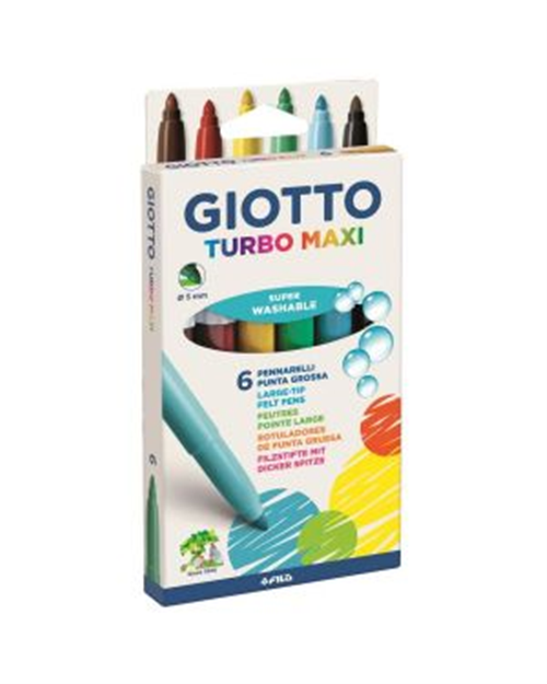 Facili da impugnare, i Giotto Turbo Maxi sono il formato gigante dei pennarelli, con la loro punta super grossa di diametro di 5 mm, per un disegno potenziato! Punta antirientro in fibra, super resistente e di lunga durata, inchiostri innocui, ottima lavabilità da mani e tessuti. Il formato è maxi anche nella protezione: cappuccio ventilato e tappo di sicurezza.