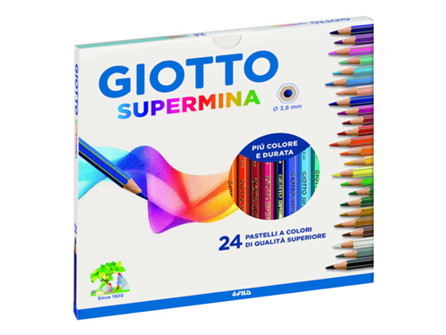GIOTTO SUPERMINA. QUANDO IL GIOCO SI FA CREATIVO, I CREATIVI INIZIANO A COLORARE! Il top della matita Giotto, perché quando si crea è meglio esagerare, e farlo con le maxi-mine dei pastelli Giotto Supermina. Ottima resa e lunga durata, con la sua mina extra-large di qualità superiore – del diametro di 3,8 mm – facile da temperare, estremamente ergonomica.