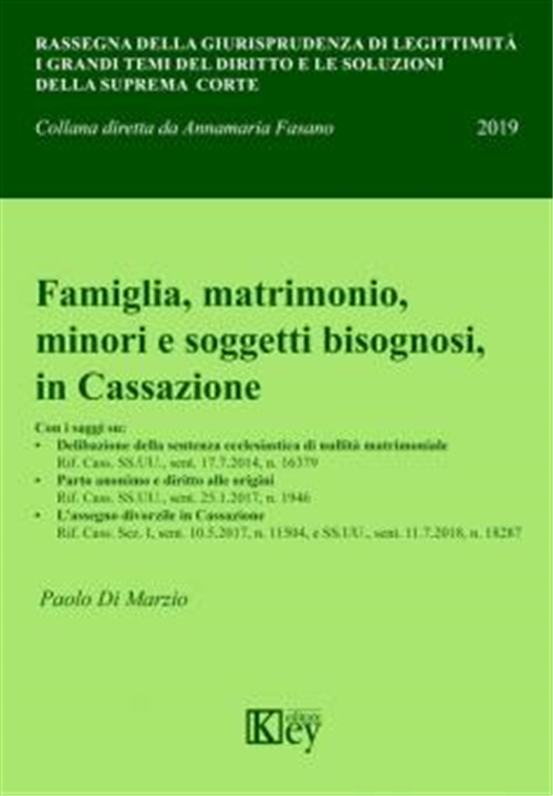 Il volume sulle decisioni della Suprema Corte in materia di diritto di famiglia, matrimonio e minori, si propone in realtà un duplice obiettivo. In primo luogo intende assicurare al lettore una informazione completa sulle decisioni assunte in questo ambito dalla Suprema Corte in tempi recenti. L’autore cura da tempo queste materie per la Rassegna ufficiale delle decisioni della Suprema Corte, che è pubblicata ogni anno per i tipi del Poligrafico dello Stato. La rassegna proposta in questa sede è però diversa, non solo perché ne è stata rivista la sistematica, ma soprattutto perché è stata completata mediante note a piè di pagina, che permettono al lettore di rinvenire i richiami e le citazioni di cui può avere necessità ogni volta che intenda esaminare a fondo un singolo argomento. La seconda parte del volume è specificamente dedicata all’approfondimento, e propone alcuni saggi redatti dall’autore sulle questioni di maggiore impatto sociale di cui si è occupata in questi ultimi anni la Suprema Corte, dalla quantificazione dell’assegno divorzile al diritto alla conoscenza delle origini dei figli adottivi, alla delibazione della sentenza ecclesiastica di nullità matrimoniale. All'nterno sono contenuti i saggi su: - Delibazione della sentenza ecclesiastica di nullità matrimoniale (Rif. Cass. SS.UU., sent. 17.07.2014, n. 16379) - Parto anonimo e diritto alle origini (Rif. Cass. SS.UU., sent. 25.01.2017, n. 1946) - L'assegno divorzile in Cassazione (Rif. Cass. sez. I, sent. 10.5.2017, n. 11504, e SS.UU., sent. 11.7.2018, n. 18287)