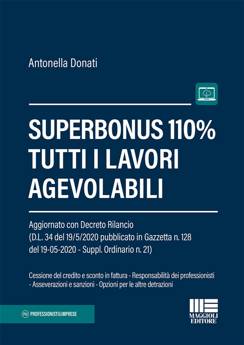 Il testo analizza in maniera esplicativa e dettagliata il nuovo superbonus al 110% per gli interventi di risparmio energetico più impegnativi e per il sismabonus. Nella trattazione vengono affrontati sia la possibilità di usufruire dello sconto in fattura sia la cessione del credito agli intermediari finanziari in cambio di liquidità. L’autrice si sofferma anche sulle altre opportunità previste fino al 31 dicembre 2021 come le ristrutturazioni al 50%, l’ecobonus al 65% e per il bonus facciate, come pure per i pannelli solari e le colonnine di ricarica delle auto elettriche. Potranno essere cedute alle banche anche le rate delle detrazioni non ancora utilizzate e durante lo svolgimento vengono analizzati anche le sanzioni per fa L se attestazioni ed il tema del recupero delle agevolazioni indebite. Nel libro vengono esposti in dettaglio tutti i lavori che danno diritto all’ecobonus, le condizioni per averli, le verifiche tecniche obbligatorie. Verranno resi disponibili aggiornamenti online con le istruzioni operative fornite dall’Agenzia delle Entrate per rendere il credito immediatamente utilizzabile ed eventuali interventi normativi fino al 30 settembre 2020. Antonella Donati è giornalista professionista, ha al suo attivo diversi anni di giornalismo parlamentare con particolare attenzione approvazione delle misure di carattere finanziario e alle manovre di bilancio. In questo ambito si occupa espressamente di tematiche fiscali, contributive e previdenziali. È autrice di numerosi volumi, articoli e saggi in materia.