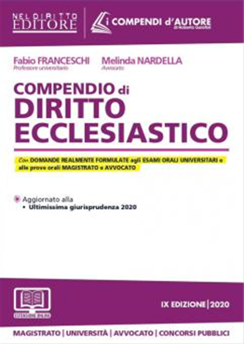 Il Compendio di diritto ecclesiasitco, di Fabio Franceschi e Melinda Nardella, si inserisce nella collana "I Compendi d'Autore", destinata a chi si appresta alla preparazione degli esami orali per l'università, per Avvocato, per il concorso di Magistrato e per i concorsi pubblici. Il volume fornisce una analisi completa e, tuttavia, sintetica e schematica, della disciplina, degli istituti di parte generale e speciale, con segnalazione anche della giurisprudenza più significativa illustrata in appositi Focus. Il Compendio è stato redatto per agevolare una rapida memorizzazione con l'esposizione "per punti" delle principali tesi emerse in dottrina e in giurisprudenza sulle questioni più problematiche: è frequente, inoltre, l'uso di grassetti e corsivi per i concetti-chiave di ogni singolo istituto; consente, infine, di saggiare il livello di preparazione, fornendo, per ciascun capitolo, le domande più probabili e ricorrenti su cui è utile che gli aspiranti avvocati, magistrati, funzionari e dirigenti si esercitino.