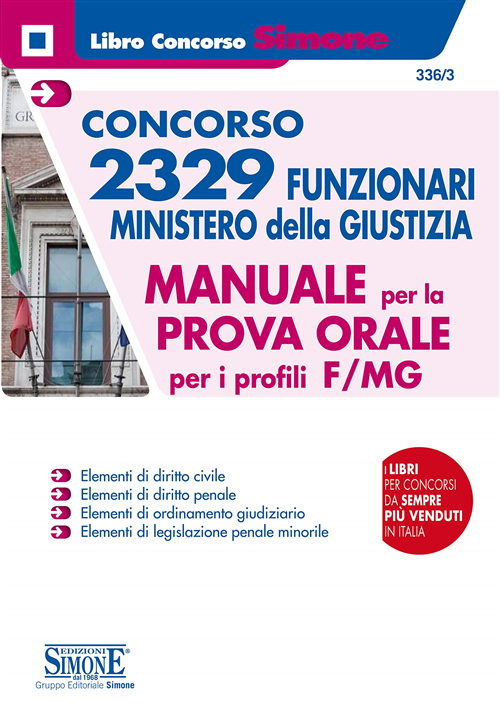 Con la G.U. 26 luglio 2019, n. 59 è stato bandito il concorso per 2329 Funzionari del Ministero della giustizia, di cui 2242 Funzionari giudiziari, 39 Funzionari amministrativi e 20 Funzionari dell'organizzazione, identificati con il codice F/MG. Superata la prova preselettiva e la successiva prova scritta, i candidati devono prepararsi per la prova orale che avrà ad oggetto oltre alle materie previste per la prova scritta (diritto amministrativo, diritto processuale civile, diritto processuale penale, ordinamento penitenziario) anche elementi di diritto civile, elementi di diritto penale, elementi di ordinamento giudiziario ed elementi di legislazione in materia penale minorile. Questo manuale, finalizzato alla preparazione della prova orale, riporta quindi la trattazione teorica delle seguenti materie: elementi di diritto civile; elementi di diritto penale; elementi di ordinamento giudiziario; elementi di legislazione penale minorile. Per completare la preparazione il testo va affiancato al Manuale della prova scritta (cod. 336/2) che contiene la trattazione delle altre materie richieste per la prova orale, già studiate per la prova scritta.