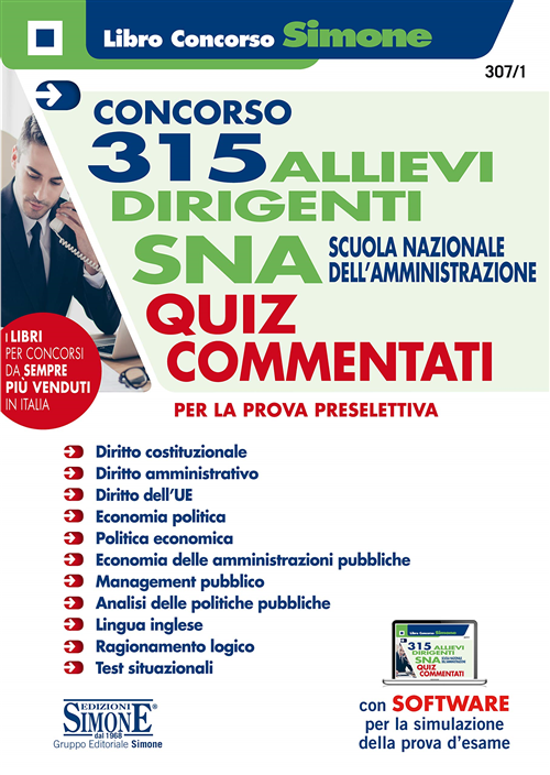 Con bando pubblicato nella Gazzetta Ufficiale del 30 giugno 2020, n. 50, è stato indetto un concorso per l’ammissione di 315 allievi al corso-concorso selettivo di formazione dirigenziale nella Scuola Nazionale dell’Amministrazione (SNA) e per il successivo reclutamento di 210 dirigenti nelle amministrazioni statali. Gli esami consistono in una prova preselettiva, due prove scritte e una orale. Questo testo rappresenta un utile supporto per la preparazione alla prova preselettiva del concorso, che consiste in questionario a risposta multipla su test situazionali e sulle seguenti materie: - Diritto costituzionale; - Diritto dell’Unione europea; - Diritto amministrativo; - Economia politica; - Politica economica; - Economia delle amministrazioni pubbliche; - Management pubblico; - Analisi delle politiche pubbliche; - Lingua inglese; - Ragionamento logico. Il volume comprende numerosi quiz a risposta multipla su tutte le materie e test situazionali, nonché un software per infinite simulazioni della prova d’esame. Per la completare la preparazione a tutte le prove del concorso si segnala “315 Allievi dirigenti SNA – Manuale per tutte le prove: preselettiva, scritte, orale” (cod. 307).
