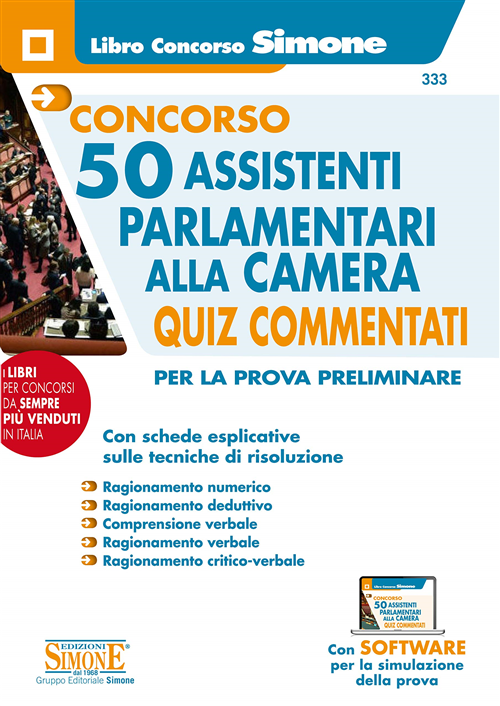 Sulla Gazzetta Ufficiale n. 9 del 31 gennaio 2020 è stato pubblicato il bando per il reclutamento di 50 Assistenti parlamentari alla Camera dei deputati (codice CO4). Questo Manuale si propone come utile sussidio di preparazione alla prova preliminare del concorso, consistente in 60 quesiti attitudinali a risposta multipla dei quali 20 di carattere logico-matematico (ragionamento numerico, ragionamento deduttivo e ragionamento critico-numerico) e 40 di carattere critico-verbale (comprensione verbale, ragionamento verbale, ragionamento critico-verbale). In questo Manuale viene, pertanto, affrontata la trattazione dei seguenti argomenti: Ragionamento critico-verbale, con schede esplicative e quiz commentati su: Sinonimi e contrari, Significati di termini e modi di dire, Serie di termini, Termini e frasi da completare, Analogie verbali, Ragionamento verbale con coppie di parole, Grammatica, Anagrammi, Comprensione di brani; Ragionamento logico-matematico, con schede esplicative e quiz commentati su: Serie numeriche, alfabetiche, alfanumeriche, Ragionamento numerico-deduttivo, Aritmetica, algebra, "problem solving", Equazioni simboliche, Abbinamenti lettere-numeri, Ragionamento critico-numerico; Ragionamento logico-deduttivo, con schede esplicative e quiz commentati su: Ragionamento astratto e abilità visive, Relazioni di ordine e grandezza, Brani con relazioni d'ordine, Insiemi, Logica deduttiva (deduzioni semplici, sillogismi, negazioni, condizione sufficiente/necessaria/necessaria e sufficiente). A completamento dell'opera, un software (accessibile tramite QR-Code) con migliaia di quiz, per innumerevoli esercitazioni e simulazioni della prova d'esame. Questo Kit contiene il volume "Concorso 30 Assistenti Parlamentari al Senato. Quiz commentati per la prova preliminare".