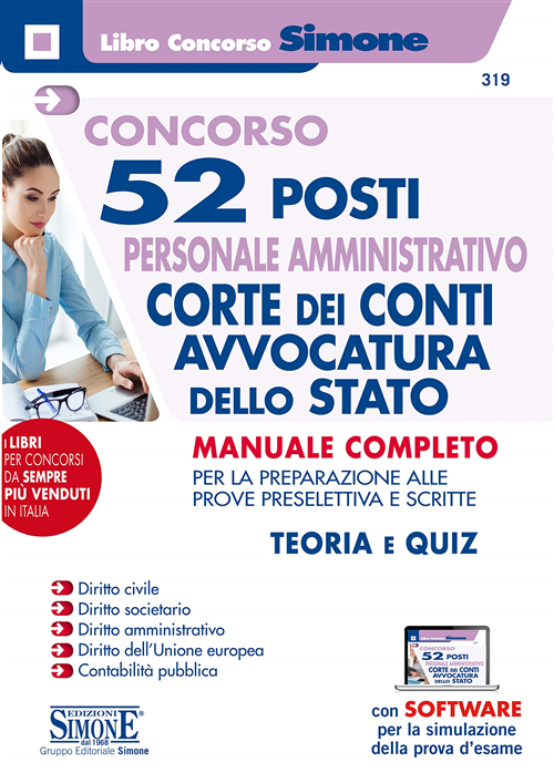 In G.U. 7-8-2020, n. 61 è stato bandito un concorso pubblico, per esami, per la copertura di complessivi 52 posti di personale amministrativo Corte dei conti e Avvocatura dello Stato. In particolare, i posti messi a concorso sono così ripartiti: 40 unità presso la Corte dei conti; 12 unità presso l'Avvocatura dello Stato. Questo Manuale contiene la trattazione teorica, e i relativi quiz a risposta multipla, delle materie oggetto sia della prova preselettiva sia di quelle scritte, che sono: Diritto civile; Diritto societario; Diritto amministrativo; Diritto dell'Unione europea; Contabilità pubblica. Il libro, arricchito da espansioni online di approfondimento e da un software per esercitarsi in infinite simulazioni della prova preselettiva, rappresenta, dunque, un valido strumento per la preparazione delle prove d'esame.