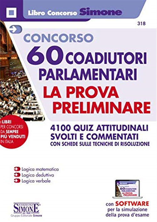 Sulla G.U. n. 80 dell'8-10-2019 è stato pubblicato il bando del concorso pubblico, per esami, a 60 posti di Coadiutore parlamentare nel Senato della Repubblica. I candidati dovranno anzitutto sostenere una prova preliminare consistente in 50 quesiti attitudinali a risposta multipla, dei quali 20 a carattere logico-matematico (ragionamento numerico, ragionamento deduttivo) e 30 a carattere critico-verbale (comprensione verbale, ragionamento verbale, ragionamento critico-verbale). Questo manuale, che si propone come strumento per il superamento della prova preliminare, raccoglie più di 4.100 quiz, per consentire ai concorrenti di esercitarsi in tutte le tipologie di quesiti attitudinali che più spesso ricorrono in sede concorsuale. Alcuni quiz sono inediti, mentre altri sono stati selezionati da banche-dati ufficiali utilizzate in recenti concorsi. Il numero delle opzioni di risposta varia da un minimo di 3 a un massimo di 4 o 5, in quanto variabile e imprevedibile è il numero di risposte multiple in sede di concorso, fermo restando che i quiz a tre risposte sono generalmente più facili rispetto agli altri, a loro volta complicati dalla presenza di più «distrattori». Tutti i quesiti sono corredati di risposte commentate, per «guidare» il lettore nella risoluzione giusta. In molti casi, per tipologie di domande simili vengono proposte chiavi di risoluzione diverse, in modo che il candidato possa scegliere, volta per volta, quella da lui ritenuta più «intuitiva» e congeniale. Inoltre, ogni tipologia di quiz è preceduta da un'apposita scheda esplicativa, la quale spiega i criteri logici che sono alla base di una determinata categoria di quesiti, fornendo le chiavi di risoluzione generali. A completamento dell'opera, un software per la simulazione della prova d'esame con tutti i quiz contenuti nel volume e 3 videolezioni di logica utilissime per completare la preparazione, accessibili tramite il QR-Code riportato nel manuale.