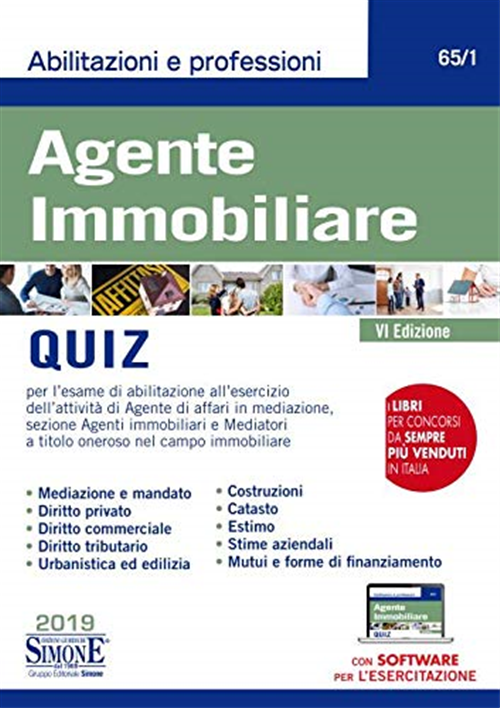 Il volume raccoglie numerosi questionari, redatti sulla falsariga di quelli proposti dalle principali Camere di Commercio, con risposte ampiamente commentate e schemi per l'autovalutazione finale su tutte le discipline previste dalla prova d'idoneità per l'esercizio dell'attività di Agente di affari in mediazione, sezione Agenti immobiliari e Mediatori a titolo oneroso nel campo immobiliare. Alla fine di ogni questionario sono presenti, inoltre, completi schemi riepilogativi che agevolano la memorizzazione dell'argomento trattato. Il testo si compone di due parti: una dedicata alle discipline giuridiche (regolamentazione dell'attività di mediatore, diritto privato, diritto commerciale, pubblicità e trascrizioni, diritto tributario); l'altra che esamina aspetti tecnico-immobiliari e tecnico-finanziari (urbanistica, edilizia, mutui e finanziamenti, costruzioni, catasto, estimo, stime di fabbricati e aree edificabili, stime aziendali). Esso, pertanto, rappresenta un indispensabile complemento di studio e un efficace sussidio per verificare in ogni momento la preparazione raggiunta e mirare il ripasso finale delle discipline più complesse. I quiz sono riproposti nel software allegato, per infinite possibilità di simulazione della prova d'esame. Per completare la preparazione Abilitazioni e A Abilitazioni e professioni