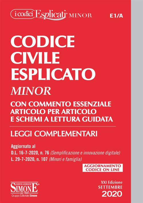La collana dei codici Esplicati Minor di cui fa parte, Codice Civile Esplicato minor, costituisce un ulteriore strumento di studio e/o lavoro per quanti abbiano la necessità di consultare rapidamente un testo codicistico corredato da un agile commento esplicativo. In calce agli articoli del codice, infatti, sono riportate brevi annotazioni esplicative che facilitano la lettura delle singole norme guidando il lettore verso una immediata comprensione dello spirito e della lettera di ciascuna disposizione. A tal fine, sono riportati in appendice una serie di Schemi a lettura guidata, sui principali argomenti e istituti, che seguono l'ordine sistematico tradizionale; in particolare, a fronte di una pagina di schema, vengono presentate le definizioni delle «parole-chiave» di ciascuno schema. Il libro risulta particolarmente utile sia in affianco ai tradizionali testi di studio sia per una rapida consultazione della normativa codicistica che, grazie al formato pratico e maneggevole, può essere d'ausilio anche nelle aule giudiziarie. Un'accurata selezione di norme speciali: Adozione, Consumatore, Matrimonio e Divorzio, Persone giuridiche, Riforma della magistratura onoraria, Stato civile, Testamento biologico, Unioni civili e Convivenze, infine, completa e arricchisce il volume. Un ampio corredo di indici: sistematico, analitico-alfabetico e cronologico completa il volume e facilita la ricerca del dato normativo.