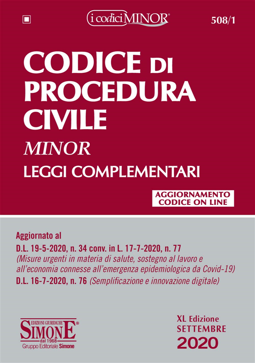 Questa XL edizione del Codice di Procedura Civile minor viene dato alle stampe per dar conto di tutte le novità normative che in varia misura hanno interessato la materia processual-civilistica. Il testo, nel tradizionale formato pratico e maneggevole, ha conservato la caratteristica dei percorsi di lettura facilitati, evidenziati dall'uso del neretto per consentire un immediato inquadramento della ratio della norma. Anche le norme complementari sono state completamente rivisitate e puntualmente aggiornate (Equa riparazione, Fallimento, Giudice di pace, Locazioni, Mediazione, Notificazioni e processo telematico, Riforme processuali, Riti semplificati, Spese di giustizia, Termini processuali e sospensioni per emergenza COVID-19). La riforma della magistratura onoraria è riportata nell'appendice Riforme processuali insieme agli articoli del codice di procedura civile modificati, ma che entreranno in vigore dal 31-10-2025. Un dettagliato indice analitico-alfabetico ed un puntuale indice cronologico chiudono il volume consentendo un immediato reperimento delle norme.