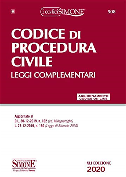 Questa XLI edizione del Codice di Procedura Civile viene data alle stampe a seguito di tutti i recenti provvedimenti che hanno interessato la normativa processualcivilistica. Da segnalare, tra i più recenti provvedimenti che hanno interessato il lavoro, il D.L. 30-12-2019, n. 162, cd. Milleproroghe e la L. 27-12-2019, n. 160, Legge di bilancio 2020. Anche la parte relativa alle norme complementari è stata puntualmente rivisitata ed aggiornata per offrire a studenti e/o operatori del settore un quadro d'insieme della normativa processuale più interessante e significativa. Con l'emanazione a febbraio 2019 del nuovo Codice della crisi d'impresa e dell'insolvenza (D.Lgs. 12-1-2019, n. 14) tutta la normativa relativa al fallimento ha subito importanti modifiche che, stante l'entrata in vigore differita ad agosto 2020 sono riportate in testo nella normativa di riferimento: in pratica, fino a quella data ci sarà un doppio regime: quello del R.D. 267/1942 per le procedure pendenti e per quelle introdotte fino ad agosto 2020 e quello nuovo, del D.Lgs. 14/2019, destinato ad applicarsi nelle procedure introdotte successivamente. Il testo è completato da un ampio corredo di indici: sistematico, cronologico ed analitico-alfabetico, per un immediato e preciso reperimento della norma.