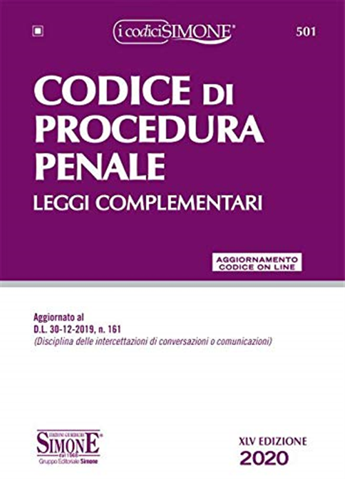 Questa edizione del Codice di Procedura Penale dà conto delle più recenti modifiche intervenute nell'ambito processual-penalistico e costituisce uno strumento aggiornato e di facile consultazione per coloro che, per motivi di studio e/o lavoro, sono costretti quotidianamente ad approcciarsi ad una realtà processuale in continua evoluzione. Tra gli ultimi provvedimenti più significativi vale la pena segnalare il D.L. 30-12-2019, n. 161 che ha ulteriormente modificato la disciplina delle intercettazioni. Il testo presenta un corredo di norme complementari (Amnistia e indulto; Avvocati; Collaboratori di giustizia; Corte costituzionale e giudizi d'accusa; Corti d'Assise; Depenalizzazione; Giudice di pace; Giusto processo; Mafia e misure di prevenzione; Mandato d'arresto europeo; Manifestazioni sportive; Minoranze linguistiche; Minori; Notificazioni e processo telematico; Ordinamento giudiziario; Ordinamento penitenziario; Ordine pubblico; Sequestro di persona ed estorsione; Spese di giustizia; Stupefacenti) che consentono una panoramica completa e aggiornata della normativa penal-processuale. Il lavoro è completato da una serie di indici (sistematico, analiticoalfabetico e cronologico) che ne facilitano la consultazione e permettono un immediato reperimento delle norme.