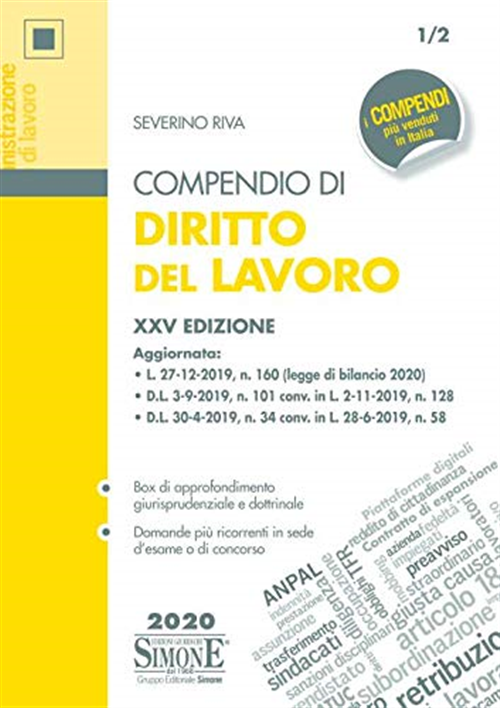 Il "Compendio di diritto del lavoro" offre un quadro completo e organico della materia, illustrandone in sintesi e con chiarezza tutti gli istituti fondamentali. Il testo è aggiornato a tutti i più recenti provvedimenti legislativi, tra cui: il D.L. 34/2019 conv. in L. 58/2019 (cd. Decreto Crescita), con il quale è stato introdotto, in via sperimentale per il biennio 2019-2020 e in presenza di particolari condizioni richieste dalla legge, il contratto di espansione (che, ferma restando la disciplina transitoria, ha sostituito i contratti di solidarietà cd. espansivi); il D.L. 101/2019 conv. in L. 128/2019 (cd. Decreto Tutela Lavoro), che ha previsto, da un lato, diverse novità (es. in materia di presunzione di subordinazione, di tutela del lavoro tramite piattaforme digitali), dall'altro, ha introdotto rilevanti modifiche nella disciplina di alcuni fondamentali istituti (es. in materia di comunicazioni obbligatorie relative al rapporto di lavoro); la L. 160/2019 (legge di bilancio 2020), che ha inciso su svariati istituti (es. in materia di congedo di paternità, di ammortizzatori sociali in deroga). La trattazione, inoltre, evidenzia le tematiche di maggiore importanza e attualità riportando, in appositi riquadri, anche approfondimenti dottrinali e giurisprudenziali (es. Corte Cost. 194/2018; Corte Cost. 4/2019). La collaudata sistematica espositiva della manualistica Simone (differenti corpi di stampa, uso del neretto e del corsivo, questionari di riepilogo alla fine di ogni capitolo) completa, poi, l'opera, agevolando lo studio della disciplina, talvolta eccessivamente corposa e complessa proprio in virtù dei continui interventi normativi di riforma. Per tali caratteristiche, il volume soddisfa le esigenze degli studenti universitari, costituendo al contempo un valido sussidio per i partecipanti a pubblici concorsi o a corsi di aggiornamento professionale.