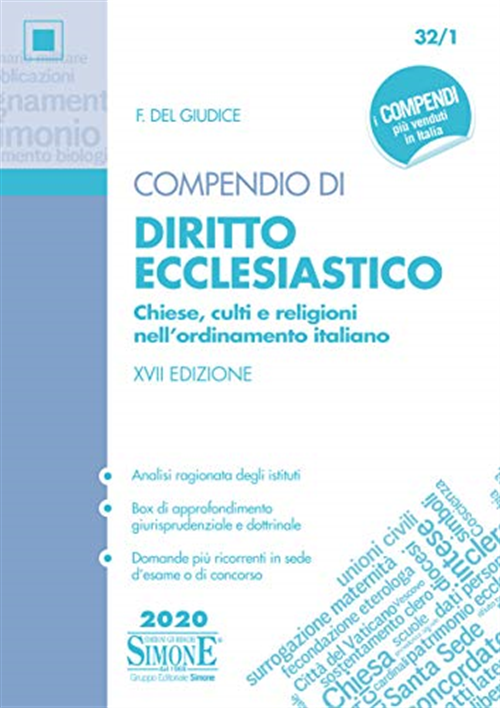 Il Compendio di Diritto Ecclesiastico costituisce uno strumento di studio indispensabile per conoscere il rapporto tra ordinamento giuridico statale e confessioni religiose, in un momento storico caratterizzato dal pluralismo culturale e religioso. In tal senso, la dizione «diritto ecclesiastico» andrebbe sostituita con «diritto delle religioni e dei culti» in modo così più conforme ai principi della Costituzione, che riconosce e garantisce l’identità di ciascuna confessione religiosa. Si avverte oggi il superamento di quel confessionismo che non consentiva all’ordinamento italiano di adeguare la propria legislazione alle mutate esigenze sociali. Basti pensare a quanto accaduto con le unioni civili (eterosessuali e omosessuali) che hanno ottenuto il riconoscimento giuridico dopo aver avuto per anni una parziale tutela solo grazie all’opera della giurisprudenza, soprattutto costituzionale. Il Compendio, comunque, pur presentando un’analisi critica del diritto ecclesiastico, conserva una trattazione tradizionale per mettere il lettore in condizione di prepararsi al meglio in vista dell’esame di abilitazione di avvocato nonché di esami universitari.