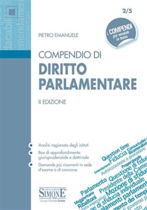 Il Diritto parlamentare è¨ l'insieme delle norme che disciplinano il Parlamento con riferimento alla sua organizzazione interna, alle sue funzioni, ai rapporti che ha con gli altri organi e soggetti pubblici. Spesso si parla anche di Procedura parlamentare per evidenziare come molte di queste norme facciano riferimento ai procedimenti che il Parlamento segue nello svolgimento della propria attività. Questo compendio tratta i due aspetti (teorico e procedurale) di una disciplina che, nonostante la centralità dell'organo costituzionale cui si riferisce (il Parlamento appunto), resta ancora poco conosciuta. Il testo, in particolare, tiene conto della riforma organica apportata al Regolamento del Senato (G.U. n. 15 del 19 gennaio 2018), che mira a ottimizzare il procedimento di decisione parlamentare, e delle modifiche intercorse negli anni al Regolamento della Camera dei Deputati. Il Compendio di Diritto Parlamentare, pertanto, affrontando con rigore ed esaustività la materia, risulta indispensabile per coloro che devono sostenere esami universitari e concorsi pubblici, come ad esempio quello per Consigliere parlamentare. Ad ogni modo, lo studio del diritto parlamentare è utile anche per comprendere gli accadimenti decisivi del nostro ordinamento costituzionale (ad es. la mozione di sfiducia al Governo) e, soprattutto, per cogliere i punti essenziali della vita quotidiana delle nostre istituzioni (dall'iter di approvazione di una legge alla costituzione di un Gruppo parlamentare).