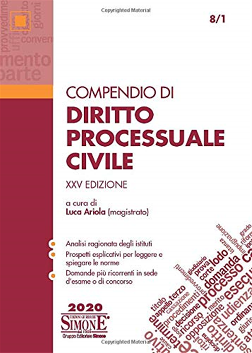 Il "Compendio di diritto processuale civile" offre un quadro sintetico, completo e chiaro del diritto processuale civile. Esso consente un rapido ma non superficiale studio di questa complessa materia, la cui comprensione risulta talora ostacolata dal rapido succedersi delle riforme che non di rado difettano di coerenza e organicità. Nella presente edizione, tra le recenti novità legislative è stata riservata parti-colare attenzione alla L. 12-4-2019, n. 31 («Disposizioni in materia di azione di classe (CLASS ACTION)»), che reca una profonda riforma dell'azione di classe, peraltro introducendo un nuovo titolo nel quarto libro del codice di procedura civile (artt. 840bis-840sexiesdecies). Si è dato conto, inoltre, delle modifiche apportate dalla L. 28-2-2020, n. 8 (di conversione del D.L. 30-12-2019, n. 162, cd. Milleproroghe) alla disciplina in tema di modalità di custodia dei beni immobili pignorati e all'entrata in vigore dell'ampliamento delle competenze del giudice di pace in materia civile. È stata ampiamente rivista la parte relativa alle impugnazioni, nel tentativo di dar conto nella maniera più organica possibile dei molteplici interventi normativi che negli anni ne hanno modificato la struttura. Come di consueto, l'esposizione di tutti gli istituti processuali - illustrati con quello stile semplice e schematico che costituisce il tratto distintivo del compendio - è avvenuta ponendo in rilievo i profili normativi più importanti, in modo da offrire una sintesi efficace ed esauriente degli stessi, nonché le ricadute pratiche della disciplina positiva, sì da consentire anche al lettore meno esperto di comprendere gli effetti che essa produce sui delicati meccanismi del processo. Un dettagliato indice analitico-alfabetico completa il volume per consentire l'immediata individuazione dell'argomento cercato.