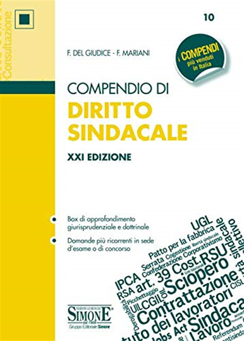 Il "Compendio di diritto sindacale" fornisce un quadro completo e organico della materia che permette di conseguire una preparazione esaustiva e rigorosa. La trattazione è aggiornata al Patto per la fabbrica, il cui obiettivo è stato quello di realizzare un ammodernamento del sistema della contrattazione collettiva e delle relazioni industriali, nonché all'Accordo interconfederale sulla rappresentanza e pariteticità in materia di salute e sicurezza. L'opera si avvale di un linguaggio semplice e chiaro; i diversi corpi e caratteri di stampa consentono di graduare la preparazione e facilitare la memorizzazione. Inoltre, allo scopo di permettere una corretta soluzione delle questioni giuridiche più importanti e attuali, il testo riporta, in appositi riquadri, gli orientamenti dottrinali e giurisprudenziali più autorevoli e consolidati. Ogni capitolo, poi, è corredato di un questionario riepilogativo degli argomenti trattati. Per tali caratteristiche, il volume può soddisfare le esigenze sia degli studenti universitari, sia dei partecipanti a pubblici concorsi o a corsi di aggiornamento professionale e di quanti, in generale, siano interessati al fenomeno sindacale.