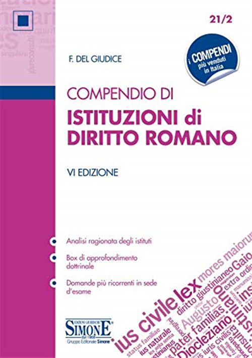 Lo studio del diritto romano, pur costituendo un presupposto necessario per la comprensione di altre discipline giuridiche (si pensi ad esempio al diritto privato), costituisce un "ostico" appuntamento per gli studenti, anche in ragione della necessaria, ma sempre più «dismessa», conoscenza della lingua latina. Per rispondere alle esigenze di quanti sono tenuti a confrontarsi con parole e lemmi in lingua latina, spesso sconosciuti, è stato pubblicato il presente Compendio di Istituzioni di Diritto Romano che tratta la disciplina in linea con i principali programmi universitari. Grazie all'estrema linearità, l'opera soddisfa anche le necessità di quanti devono affrontare il concorso in magistratura, al T.A.R. e al Consiglio di Stato, che richiedono nella prova di diritto civile anche la conoscenza di elementi fondamentali di diritto romano. L'esposizione degli argomenti istituzionali è corredata da box di approfondimento, nonché da brevi e mirate «incursioni dottrinali» per fornire una visione più completa della materia e favorire gli opportuni raffronti col diritto vigente. Al fine di una migliore comprensione della terminologia romanistica si suggerisce, tramite il QR Code posto in copertina, la consultazione del Dizionario Giuridico Romano (in vendita anche come applicazione Apple), di cui sono riportate, a titolo esemplificativo, numerose voci. Attraverso il QR Code è possibile consultare anche il Dizionario breve Latino-Italiano che, oltre alla terminologia essenziale riporta anche le espressioni più significative del lessico giuridico.