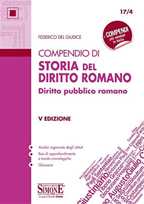 La Storia del diritto romano è una disciplina di particolare attualità perché consente di cogliere le origini illustri del nostro ordinamento e di quelli di derivazione latino-germanica, compreso quello dell’Unione europea. Lo studio di questa materia, soprattutto relativamente all’analisi dei rapporti di forza tra gli organi dello Stato nei diversi periodi storici dell’antica Roma, si rivela particolarmente formativo, offrendo numerosi spunti di riflessione e di confronto con l’attualità politica. Nella “Respublica”, ad esempio, vigevano regole etiche non scritte come la dignitas che escludeva dal cursus honorum (cioè dalle cariche politiche) coloro che si erano resi responsabili di comportamenti non consoni alla gestione della cosa pubblica. Questa V edizione, arricchita ed ampliata, offre un panorama della storia dell’ordinamento giuridico romano dalle origini di Roma (753 a.C. ca.) fino a Giustiniano I (565 d.C.). La trattazione, tenendo conto delle difficoltà che si possono incontrare nello studio della materia, utilizza un linguaggio semplice e le parole latine sono spesso accompagnate da traduzione. In appendice, per dare un quadro di più ampio respiro della disciplina, viene riportato un glossario degli istituti, dei protagonisti e dei loci storici che caratterizzano la storia del diritto pubblico romano.