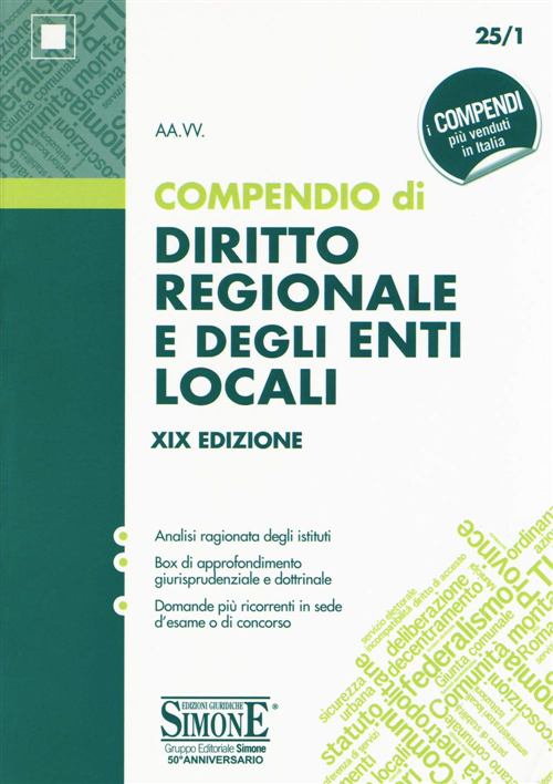 Il volume, giunto alla XIX edizione, compendia in maniera esaustiva e lineare il Diritto regionale e il Diritto degli enti locali, materie il cui studio è fondamentale vista la connotazione "regionale" della nostra Repubblica e l'affermazione del principio di sussidiarietà che ha reso le autonomie locali centro propulsore della generalità delle funzioni amministrative. Il testo è strutturato in tre Parti: la Prima in cui vengono illustrati gli enti territoriali in generale, a partire dalla loro origine storico-normativa fino al loro attuale assetto costituzionale; la Seconda riguarda le Regioni; la Terza dedicata agli enti locali (Comuni, Province e Città metropolitane). Particolare spazio è dedicato al pubblico impiego locale, materia sempre più spesso richiesta nei pubblici concorsi, ora interessata dalle novità recate dal CCNL del Comparto Funzioni Locali, firmato il 21 maggio 2018. Lo scrupoloso aggiornamento e la chiarezza dell'esposizione, arricchita da box di approfondimento, nonché da opportuni richiami giurisprudenziali, rendono il libro particolarmente adatto per una preparazione completa ed al passo con tutti i più recenti provvedimenti normativi che hanno inciso, a vario titolo, sugli argomenti trattati.
