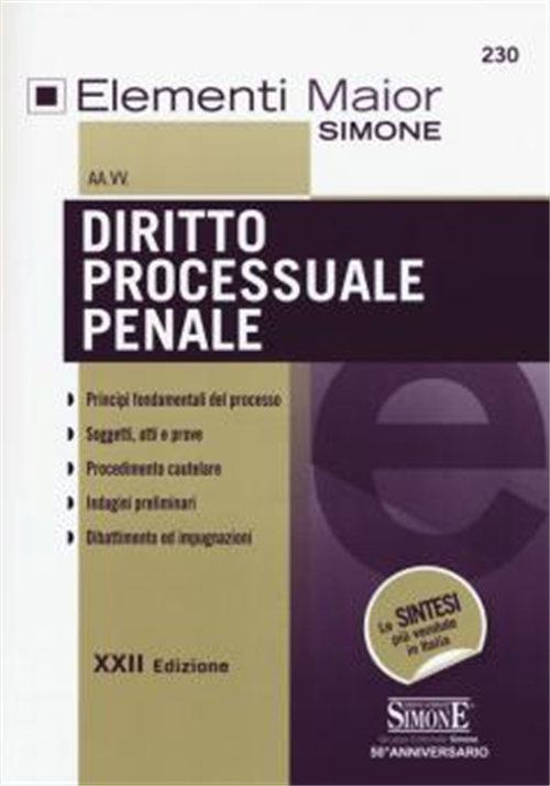 Questo volume di «elementi maior», attraverso un'agile e completa panoramica dei fondamentali argomenti di Diritto Processuale Penale, consente, grazie al linguaggio semplice e all'esposizione sintetica, una visione d'insieme del programma istituzionale. Particolare attenzione è stata prestata all'analisi di quegli argomenti che per la loro importanza potrebbero costituire, più frequentemente, oggetto di domanda d'esame. Il lavoro riporta, per ogni capitolo, un utile glossario, con le definizioni delle parole più tecniche, indispensabili per facilitare la comprensione del lessico giuridico e le più frequenti questions per mettere in evidenza gli aspetti più problematici della disciplina.