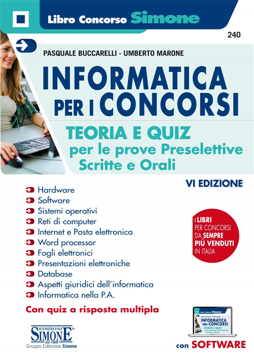 Questo testo di Informatica per i concorsi giunge alla sesta edizione profondamente rivisto e aggiornato alla luce delle novità intervenute negli ultimi anni, sia dal punto di vista tecnologico, sia da quello «sociale» (si pensi ai fenomeni delle fake news e del cyberbullismo) sia, infine, dal punto di vista normativo. Inoltre, gli argomenti sono stati rielaborati al fine di adeguarsi a quelli richiesti nei pubblici concorsi per quanto riguarda le prove preselettive, scritte e orali. Il manuale si propone l'ambizioso obiettivo di condensare in un numero limitato di pagine tutto ciò che c'è da sapere sull'utilizzo di un personal computer. Non è certamente un'impresa semplice, tenuto conto del fatto che analizzare nel dettaglio tutte le sfaccettature relative all'hardware, al software, alle reti, ai sistemi operativi, ai principali applicativi, agli aspetti giuridici dell'informatica, richiederebbe migliaia di pagine. In questa sede, però, si forniscono i principi che possono permettere a chiunque di utilizzare consapevolmente un computer e di affrontare le prove di concorso e gli esami che richiedono nozioni di informatica. Gli argomenti trattati sono finalizzati a una preparazione di base: hardware, software, Internet, reti, posta elettronica, word processor, foglio elettronico, presentazioni elettroniche e database. Un capitolo è dedicato agli aspetti giuridici dell'informatica: pirateria e diritto d'autore, protezione dei dati personali, licenze d'uso del software, informatizzazione della pubblica amministrazione. Oltre agli elementi basilari di ciascun argomento, il manuale fornisce un metodo di studio che, partendo dalle nozioni teoriche, mette immediatamente in pratica quanto studiato, con esempi e largo uso di immagini, al fine di preparare il lettore anche alle «prove pratiche» dei concorsi destinate a verificare la conoscenza delle tecnologie informatiche più diffuse. Infine, per ciascun argomento sono previsti dei test finali a risposta multipla per valutare il grado di preparazione conseguito nonché per esercitarsi in vista delle prove a quiz. A completamento dell'opera, un software (accessibile tramite Qr-Code) con il quale esercitarsi e verificare la propria preparazione con centinaia di quiz a risposta multipla.