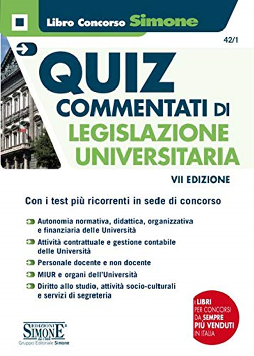 Il volume propone centinaia di quiz commentati di legislazione universitaria e rappresenta un supporto per il ripasso e per verificare il livello di apprendimento dei vari argomenti inerenti l'organizzazione universitaria, la didattica, la ricerca, il personale docente e non docente, il diritto allo studio, la gestione finanziaria e contabile, l'attività contrattuale delle università e i servizi di segreteria. Il testo è suddiviso in dodici questionari con quesiti a risposta multipla, corredati ognuno di un esaustivo e aggiornato commento. Ogni questionario è completato da uno schema di autovalutazione, al fine di verificare il grado di preparazione raggiunto. Per le sue caratteristiche questo testo si rivela di particolare utilità per coloro che sono impegnati nella preparazione di pubblici concorsi presso le Università. Dodici questionari commentati su: principi generali; autonomia normativa, didattica e organizzativa delle università; autonomia finanziaria e gestione contabile delle università; ricerca; ministero dell'Istruzione, dell'Università e della Ricerca; organi dell'Università; personale docente; personale non docente. Il rapporto di lavoro alle dipendenze delle P.A.; contratti; diritto allo studio; studenti stranieri e diversamente abili; attività socio-culturali e servizi di segreteria.