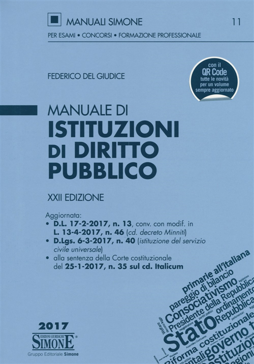 Il Manuale di Istituzioni di Diritto Pubblico, giunto alla XXII edizione, analizza gli aspetti caratterizzanti dell'ordinamento costituzionale italiano, oggi più che mai oggetto di attenzione dopo la mancata revisione della Costituzione in seguito al referendum del 4 dicembre 2016. Ciò perché la riforma, incentrata sul superamento del bicameralismo perfetto e la trasformazione del Senato in un'assemblea rappresentativa delle istituzioni territoriali, in combinato disposto con la nuova legge elettorale per la Camera (ed. Italicum), comprimeva il diritto di voto del popolo sovrano. Anche la legge elettorale ha subito, come il Porcellum, una battuta d'arresto da parte della Consulta che con sent. 35/2017 ne ha decretato l'illegittimità in relazione al ballottaggio e alla facoltà di scelta del collegio da parte del capolista in caso di una sua elezione in più collegi. Il volume dà conto di tali eventi, prendendo atto della difficile convivenza di due leggi elettorali poco omogenee che non garantirebbero la formazione di una maggioranza di governo. Il testo, inoltre, è aggiornato alle novità legislative e giurisprudenziali che hanno inciso sul diritto pubblico (ad es. la L. 163/2016 che modifica la legge di bilancio). Per come è strutturato, il manuale garantisce, dunque, una preparazione completa e documentata in vista di esami universitari e concorsi pubblici.