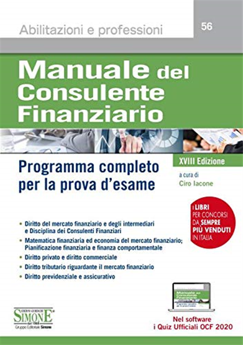 L'attività di un consulente finanziario non si limita a quella, che potremmo definire istituzionale, di ricevere e trasmettere le istruzioni o gli ordini dei clienti o, ancora, di promuovere e collocare prodotti finanziari, nonché contratti relativi alla concessione di finanziamenti o alla prestazione di servizi di pagamento. Il consulente finanziario è, infatti, tenuto ad assistere il proprio cliente in ogni fase del rapporto, verificando, ad esempio, la sua propensione al rischio e monitorando con lui, una volta sottoscritto il contratto, le performance dell'investimento effettuato e le possibilità di conseguire gli obiettivi prestabiliti. È evidente, quindi, che, per accedere alla professione, i requisiti necessari per iscriversi nell'apposito albo siano accertati sulla base di rigorosi criteri valutativi che tengono conto della pregressa esperienza professionale (documentabile) o di una prova d'esame, per superare la quale è richiesto uno studio attento e scrupoloso. Il manuale del Consulente Finanziario, indirizzato, oltre che agli aspiranti consulenti, ai formatori e agli operatori finanziari che vogliano «saperne di più» sul mondo della finanza, tratta in maniera approfondita le discipline indicate nel Bando d'esame, prendendo a riferimento le tassonomie del database ufficiale dei quesiti pubblicato sul portale dell'OCF (l'Organismo di vigilanza e tenuta dell'albo unico dei Consulenti Finanziari) nel mese di gennaio 2020. Alla fine di ogni capitolo del volume è presente un breve test di verifica con quiz a risposta aperta e l'indicazione del paragrafo in cui è trattato l'argomento oggetto della singola domanda. A corredo del testo, il software di simulazione della prova valutativa con i quiz ufficiali OCF scaricabile gratuitamente, assieme ad altri contenuti, tramite il QR-code posto all'interno del volume.