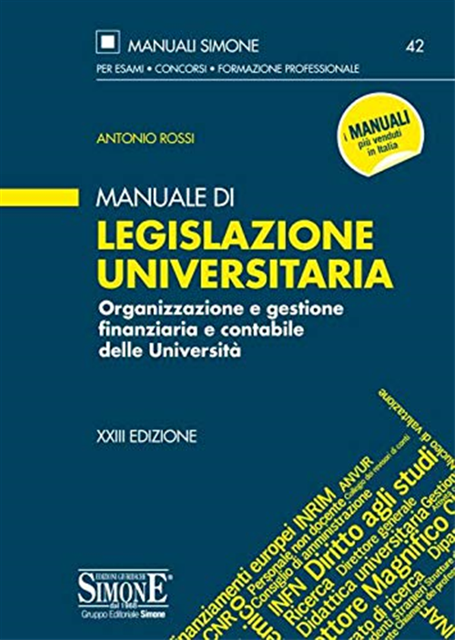 Il "Manuale di legislazione universitaria" illustra sotto il profilo giuridico i vari ambiti connessi al funzionamento e allo sviluppo del sistema universitario. Suddiviso in quattordici capitoli, esso prende in esame l'organizzazione universitaria, la didattica, la ricerca, il personale docente e non docente, il diritto allo studio, la gestione finanziaria e contabile, l'attività contrattuale delle università, quella concernente l'orientamento universitario e i servizi di segreteria. Il testo, in linea con le precedenti edizioni, oltre ad essere aggiornato ai più recenti provvedimenti normativi in materia, si configura come un valido supporto per quanti devono preparare esami e concorsi nonché per coloro che operano già nel settore e necessitano di una visione organica della normativa aggiornata.