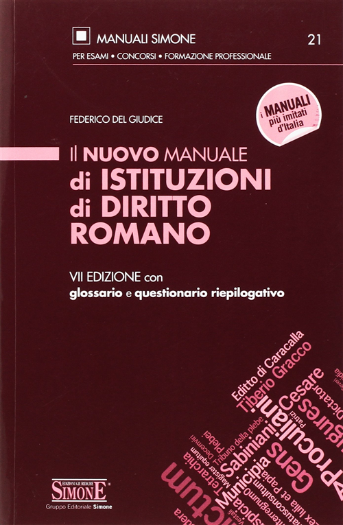 La VII edizione del "Nuovo manuale" di Istituzioni di Diritto Romano presenta una panoramica completa della materia e riserva particolare attenzione ai più recenti sviluppi della dottrina giusromanistica. Il volume, per venire incontro alle numerose difficoltà degli studenti universitari presenta, in appendice, un glossario che raccoglie, in ordine alfabetico, le singole Leges romane e ne esplica il contenuto, nonché un questionario che raccoglie e commenta le principali domande d'esame. Per favorire l'approccio con la lingua latina, nel corso della trattazione sono stati tradotti i lemmi e le espressioni più complesse, nonché si è curata l'apposizione degli accenti per una corretta pronuncia. Il testo si dimostra di particolare utilità anche per gli aspiranti magistrati che sono tenuti, per la preparazione alla prova orale, alla conoscenza del diritto romano. Il "Nuovo manuale" di Istituzioni di Diritto Romano si caratterizza anche per il raffronto con gli istituti del diritto vigente, al fine di evidenziare la continuità ideale tra il diritto romano e quello attuale.