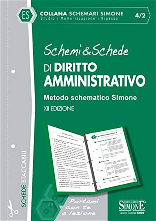 Gli schemari Simone seguono i programmi tradizionali degli Atenei ponendosi come sussidio del manuale adottato per: delineare un quadro sistematico della materia; identificare, al pari delle «slides», i punti chiave e le linee generali della disciplina; dedicare maggiore attenzione agli argomenti «caldi» più frequentemente oggetto di domande d'esame; facilitare la lettura, agevolare la memorizzazione, velocizzare il ripasso. I volumi sono strutturati in pagine staccabili per essere facilmente inserite negli schedari a fogli mobili utilizzati per prendere appunti durante le lezioni. In particolare, gli Schemi & Schede di Diritto Amministrativo costituiscono, per quanti si apprestano ad affrontare questa complessa disciplina, un utile supporto per la propria preparazione. Il lavoro, strutturato in tavole sinottiche e schemi articolati, presuppone già una conoscenza di base della materia e si raccomanda la contestuale consultazione del manuale istituzionale. Questa XII edizione si giova di una veste grafica più accattivante ed affianca agli schemi tre differenti rubriche: osservazioni, che approfondisce aspetti rilevanti della disciplina; differenze, che analizza aspetti particolari della materia, stimolando i confronti e i paralleli fra i diversi istituti; in sintesi, che offre un quadro riepilogativo degli argomenti affrontati.
