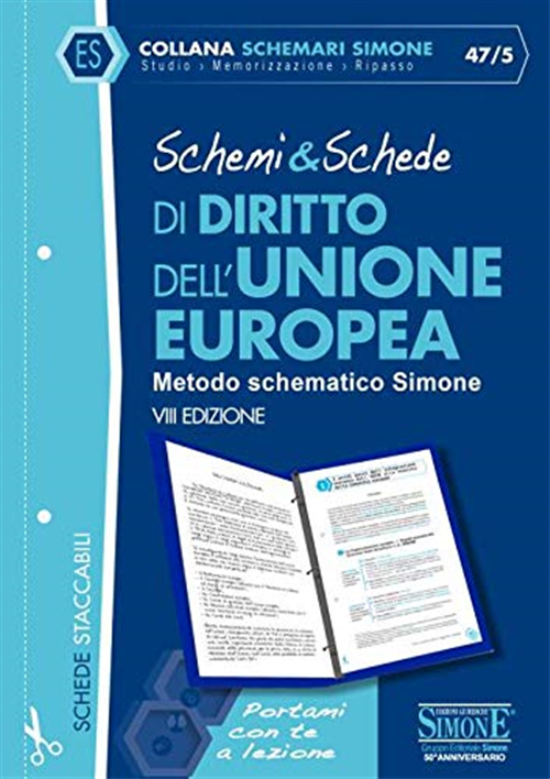 Schemi & Schede di Diritto dell'Unione Europea costituiscono, per quanti si apprestano ad affrontare questa complessa disciplina, un utile supporto per la preparazione. Il lavoro, strutturato in tavole sinottiche e schemi articolati, presuppone una iniziale conoscenza di base della materia: si raccomanda perciò lo studio contestuale del manuale istituzionale. Questo originale sussidio didattico, in cui i vari argomenti sono presentati sotto forma di schemi e schede sinottiche, si giova di una veste grafica accattivante ed affianca agli schemi tre differenti rubriche: - Osservazioni, che approfondiscono aspetti rilevanti della disciplina; - Differenze, che analizzano aspetti particolari della materia, stimolando i confronti e i paralleli fra i diversi istituti; - In sintesi, che offre un quadro riepilogativo degli argomenti affrontati. Tutti gli Schemi & Schede Simone seguono i programmi tradizionali degli Atenei ponendosi come sussidio dei manuali istituzionali per: - delineare un quadro sistematico della materia; - identificare, al pari delle «slides», i punti chiave e le linee generali della disciplina; - dedicare maggiore attenzione agli argomenti «caldi» più frequentemente oggetto di domande d'esame; - facilitare la lettura e la memorizzazione nonché velocizzare il ripasso. I volumi sono strutturati in pagine facilmente staccabili per essere inserite nei raccoglitori a fogli mobili utilizzati per prendere appunti durante le lezioni, o per essere inserite tra le pagine del testo adottato.