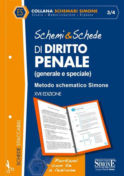 I volumi della collana "Schemari Simone" seguono i programmi tradizionali degli Atenei ponendosi come sussidio del manuale adottato per: delineare un quadro sistematico della materia; identificare, al pari delle "slides", i punti chiave e le linee generali della disciplina; dedicare maggiore attenzione agli argomenti "caldi" più frequentemente oggetto di domande d'esame; facilitare la lettura, agevolare la memorizzazione, velocizzare il ripasso. I volumi sono strutturati in pagine staccabili per essere facilmente inserite negli schedari a fogli mobili utilizzati per prendere appunti durante le lezioni. In particolare, gli Schemi & Schede di diritto Penale (generale e speciale), costituiscono, per quanti si apprestano ad affrontare questa complessa disciplina, un utile supporto per la propria preparazione. Il lavoro, strutturato in tavole sinottiche e schemi articolati, presuppone già una conoscenza di base della materia e se ne raccomanda la contestuale (o successiva) consultazione del manuale istituzionale. Questa XVII edizione affianca agli schemi tre differenti rubriche: osservazioni, che approfondisce aspetti rilevanti della disciplina; differenze, che analizza aspetti particolari della materia, stimolando i confronti e i paralleli fra i diversi istituti; in sintesi, che offre un quadro riepilogativo degli argomenti affrontati.