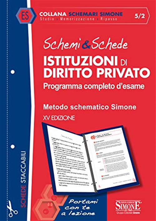 Da oggi “Schemi & Schede”, per distinguersi dalla concorrenza che tende a confondere i nostri clienti, rientra nella nuova collana “Schemari Simone”. Questi originali volumi seguono i programmi tradizionali degli Atenei ponendosi come sussidio del manuale adottato per: — delineare un quadro sistematico della materia; — identificare, al pari delle “slides”, i punti chiave e le linee generali della disciplina; — dedicare maggiore attenzione agli argomenti “caldi” più frequentemente oggetto di domande d’esame; — facilitare la lettura, agevolare la memorizzazione, velocizzare il ripasso. I volumi sono strutturati in pagine staccabili per essere facilmente inserite negli schedari a fogli mobili utilizzati per prendere appunti durante le lezioni. In particolare, gli Schemi & Schede di Istituzioni di diritto privato, costituiscono, per quanti si apprestano ad affrontare questa complessa disciplina, un utile supporto per la propria preparazione. Il lavoro, strutturato in tavole sinottiche e schemi articolati, presuppone già una conoscenza di base della materia e se ne raccomanda la contestuale (o successiva) consultazione del manuale istituzionale. Questa XV edizione si giova di una veste grafica più accattivante ed affianca agli schemi tre differenti rubriche: — osservazioni, che approfondisce aspetti rilevanti della disciplina; — differenze, che analizza aspetti particolari della materia, stimolando i confronti e i paralleli fra i diversi istituti; — in sintesi, che offre un quadro riepilogativo degli argomenti affrontati. Schemi & schede ist. diritto privato