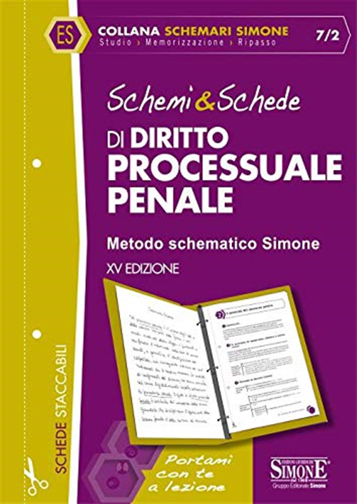 Da oggi «Schemi & Schede», per distinguersi dalla concorrenza che tende a confondere i nostri clienti, rientra nella nuova collana «Schemari Simone». Questi originali volumi seguono i programmi tradizionali degli Atenei ponendosi come sussidio del manuale adottato per: delineare un quadro sistematico della materia; identificare, al pari delle «slides», i punti chiave e le linee generali della disciplina; dedicare maggiore attenzione agli argomenti «caldi» più frequentemente oggetto di domande d'esame; facilitare la lettura, agevolare la memorizzazione, velocizzare il ripasso. I volumi sono strutturati in pagine staccabili per essere facilmente inserite negli schedari a fogli mobili utilizzati per prendere appunti durante le lezioni. In particolare, gli Schemi & Schede di Diritto Processuale Penale, costituiscono, per quanti si apprestano ad affrontare questa complessa disciplina, un utile supporto per la propria preparazione. Il lavoro, strutturato in tavole sinottiche e schemi articolati, presuppone già una conoscenza di base della materia e se ne raccomanda la contestuale (o successiva) consultazione del manuale istituzionale. Questa XV edizione si giova di una veste grafica più accattivante ed affianca agli schemi tre differenti rubriche: osservazioni, che approfondisce aspetti rilevanti della disciplina; differenze, che analizza aspetti particolari della materia, stimolando i confronti e i paralleli fra i diversi istituti; in sintesi, che offre un quadro riepilogativo degli argomenti affrontati.