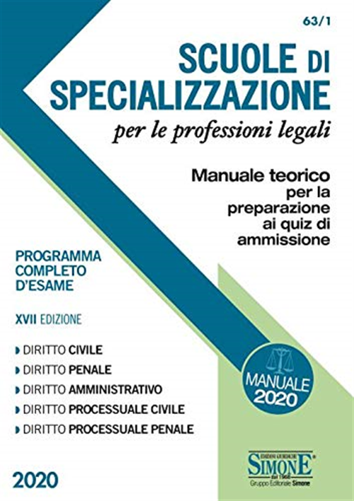 Le Scuole di specializzazione per le professioni legali (istituite con D.M. 537/1999) provvedono alla formazione comune dei laureati in giurisprudenza, attraverso un approfondimento teorico-pratico, finalizzato alla carriera di magistrato ordinario o all'esercizio delle professioni di avvocato o notaio. I corsi di tali Scuole si caratterizzano per il forte taglio pratico anche per sopperire all'impostazione meramente teorica che caratterizza la formazione universitaria. A tal fine l'attività didattica, svolta sia da docenti universitari sia da avvocati, magistrati e notai, viene svolta soprattutto attraverso esercitazioni, simulazioni di casi, stage e tirocini, formulazione di atti giudiziari, atti notarili, sentenze e pareri. La presente opera, di taglio teorico, si propone di venire incontro a tutti gli studenti che devono affrontare la prova preselettiva d'ingresso alle scuole di specializzazione. Questo volume, in particolare, è suddiviso in 5 libri dedicati ciascuno alle materie obbligatorie d'esame (diritto civile, diritto penale, diritto amministrativo, procedura civile e procedura penale) e consente un agevole ripasso delle singole discipline, in quanto tratta in maniera sintetica, ma esaustiva i principali argomenti, potenzialmente oggetto di domanda d'esame, tenendo conto che il lettore possiede già una conoscenza istituzionale acquisita durante il corso degli studi universitari: ciò spiega la peculiarità espositiva che si giova anche di tavole sinottiche soffermandosi con più attenzione sui concetti generali e sui principali istituti. Il lavoro è arricchito inoltre da esempi di domande che permettono di avere una panoramica sui possibili argomenti oggetto delle prove orali.