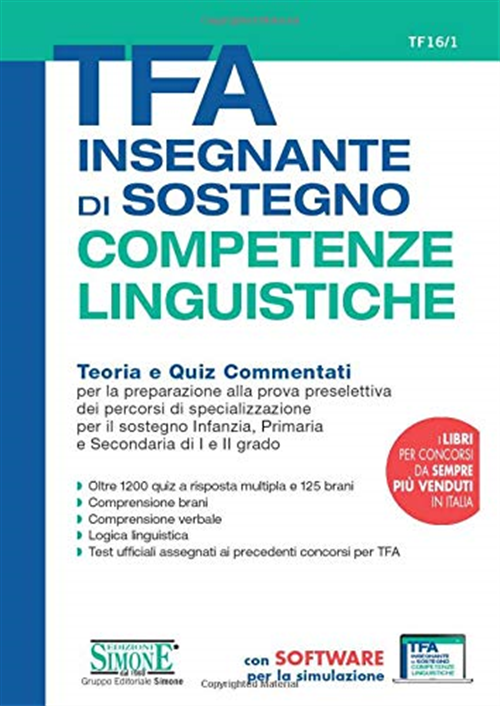 Con il D.M. 21 febbraio 2019 il MIUR ha dato avvio ai percorsi di formazione per il conseguimento della specializzazione per le attività di sostegno didattico agli alunni con disabilità nella scuola dell'infanzia, nella scuola primaria e nella scuola secondaria di I e Il grado, per complessivi 14.224 posti. La selezione si articola in varie prove, di cui la prima è un test preliminare di 60 quesiti a risposta multipla volti ad accertare le conoscenze didattiche, psicopedagogiche e giuridiche relative al profilo dell'insegnante di sostegno e il possesso delle necessarie abilità linguistiche. In particolare almeno 20 dei predetti quesiti sono volti a verificare le competenze linguistiche e la comprensione dei testi in lingua italiana. La risoluzione dei quesiti concernenti le competenze linguistiche e la comprensione dei testi necessitano dell'acquisizione di alcune tecniche di risoluzione, non sempre intuitive, e soprattutto di un grande «allenamento» per acquisire velocità nell'individuazione della risposta esatta. Questo manuale fornisce, dunque, al candidato tutti gli strumenti per affrontare i test di logica linguistica che numerosi gli verranno assegnati in sede di esame. Il testo propone 125 brani e oltre 1200 quiz a risposta multipla commentati ed è suddiviso in due parti: la prima parte è dedicata alla comprensione dei brani, la tipologia di test più frequente nelle precedenti selezioni per l'accesso ai corsi di specializzazione sul sostegno. Ad una parte teorica utile per apprendere le tecniche di risoluzione veloce, seguono centinaia di quiz a difficoltà progressiva e con risposta commentata. Una sezione è dedicata ai test assegnati nelle più recenti selezioni nella scuola, e soprattutto ai test ufficiali dei precedenti TFA; la seconda parte è invece dedicata alle altre tipologie di quesiti di logica linguistica, che spesso compaiono associati anche a quelli di comprensione verbale, tutti volti a verificare le competenze linguistiche dei candidati (analogie, sinonimi e contrari, serie di termini, comprensione e ragionamento verbale ecc.), anch'essi completi di parte teorica e risposta commentata. In appendice un'ulteriore selezione delle prove ufficiali del TFA 2016-2017. Completa il volume un software, scaricabile tramite il QRcode all'interno del volume, per esercitarsi con i quiz e brani del testo, e cimentarsi con infinite simulazioni.
