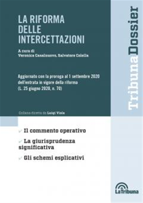 Questo volume traccia un quadro sintetico ed operativo della riforma delle intercettazioni di cui alla Legge 28 febbraio 2020, n. 7, di conversione, con modificazioni, del decreto-legge 30 dicembre 2019, n. 161. La riforma interviene sulla cosiddetta Riforma Orlando (d.lgs n. 116/2017) in materia di intercettazioni e contiene disposizioni relative all'entrata in vigore della riforma stessa, nonché modifiche al codice di procedura penale e alle disposizioni di attuazione. L'opera è corredata da una ricca selezione di giurisprudenza recante i più recenti orientamenti interpretativi consolidatisi in materia di intercettazioni nonché da utili schemi esplicativi.