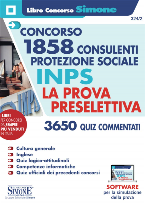 Questo Manuale è indirizzato a quanti intendono prepararsi alla prova preselettiva del concorso per 1858 Consulenti protezione sociale bandito dall'INPS. Gli oltre 3650 quiz a risposta multipla contenuti nel testo sono tutti corredati di soluzioni commentate e comprendono circa 800 quesiti ufficiali dei precedenti concorsi (365 Analisti di processo e 967 Consulenti protezione sociale), le cui varie tipologie hanno costituito il modello per l'elaborazione di tutti gli altri quiz riportati nel testo, che riguardano le seguenti materie: Cultura generale: Grammatica italiana; Letteratura; Storia; Educazione civica; Geografia; Storia dell'arte; Scienze sociali (Antropologia, Pedagogia, Psicologia, Sociologia) e Filosofia; Matematica (Aritmetica, Algebra, Geometria); Scienze naturali (Biologia, Scienze della Terra, Chimica, Fisica); Attualità; Inglese: Comprensione di brani; Quesiti grammaticali; Tematiche di attualità internazionale e di cultura generale; Informatica; Test logico-attitudinali: Comprensione di brani; Coppie di parole; Analogie concettuali; Anagrammi; Parole da scartare, serie di termini, campi semantici; Deduzioni logiche; Sillogismi; Relazioni di ordine, grandezza, parentela; Brani con relazioni d'ordine; Equazioni simboliche; Abbinamenti lettere/numeri; Insiemi; Ragionamento matematico e problem solving; Calcolo delle probabilità; Serie numeriche, alfabetiche, alfanumeriche; Grafici e tabelle; Capacità di attenzione e precisione; Logica figurale; Prove ufficiali dei concorsi precedenti. A completamento dell'opera, un software (accessibile tramite QR-Code) con migliaia di quiz per infinite esercitazioni e simulazioni della prova concorsuale. Il presente manuale costituisce una riedizione del testo 324 Concorso INPS 2020 - 3650 Quiz commentati per la preparazione alle prove preselettive e oggettivo-attitudinali dei concorsi INPS, edito a febbraio 2020.