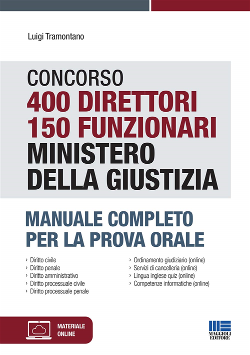 Il manuale è un utile strumento di preparazione alla prova orale dei due recenti concorsi indetti dal Ministero della Giustizia: concorso per 400 Direttori amministrativi, pubblicato sulla Gazzetta Ufficiale del 17 novembre 2020, n. 90; concorso per 150 funzionari giudiziari, pubblicato sulla Gazzetta Ufficiale del 27 novembre 2020, n. 93. Entrambi i bandi di concorso prevedono di selezionare i candidati attraverso la valutazione dei titoli e, a seguire, con una prova orale sugli argomenti indicati dal bando. Il manuale presenta in maniera chiara e approfondita tutte le materie richieste alla prova orale: diritto civile; diritto penale; diritto amministrativo (con particolare riferimento al procedimento amministrativo, alla disciplina del lavoro pubblico, alle diverse responsabilità dei dipendenti pubblici, alla disciplina degli appalti, al codice del processo amministrativo); diritto processuale civile; diritto processuale penale; ordinamento giudiziario; servizi di cancelleria. Nella sezione online collegata al libro, disponibile seguendo le istruzioni riportate in fondo al libro, saranno presenti anche le sezioni relative alla lingua inglese e alle competenze informatiche, utili per completare la preparazione dei candidati alla prova, oltre ai futuri aggiornamenti normativi. Il testo è aggiornato agli ultimi provvedimenti legislativi (Decreto Cura Italia, Decreto Rilancio, Decreto Agosto, Decreto Semplificazioni, Decreto Sicurezza e immigrazione, Decreto Ristori e Ristori-bis), presentandosi, così, come uno strumento di sicura utilità per la preparazione del candidato.