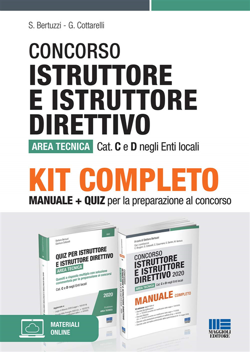 Il presente kit è uno strumento di preparazione a tutte le prove dell'esame per i concorsi pubblici da Istruttore e Istruttore direttivo dell'Area tecnica (cat. C e D), indetti dagli Enti locali. È composto da: manuale di preparazione Istruttore e Istruttore direttivo area tecnica (ed. 2020); raccolta di quesiti a risposta multipla Quiz per istruttore e istruttore direttivo area tecnica (ed. 2020) che permette la veloce e sicura autoverifica di quanto appreso e, allo stesso tempo, di esercitarsi e familiarizzare con la tipologia di prova a quiz. I volumi sono aggiornati alle più recenti normative: Decreto Semplificazioni (D.L. n. 76/2020 convertito con modificazioni dalla Legge n. 120/2020); Decreto Rilancio (D.L. n. 34/2020 convertito con modificazioni dalla Legge n. 77/2020); Decreto sulla prestazione energetica in edilizia (D.lgs. n. 48/2020); Decreto sulla normativa antincendio delle autorimesse (D.M. 15 maggio 2020). La combinazione dei due volumi è di sicura utilità per la preparazione a tutte le prove concorsuali.