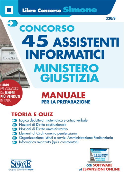 Il Manuale «Concorso 45 Assistenti Informatici nel Ministero della Giustizia» è diretto alla preparazione della prova preselettiva e delle prove scritte del concorso, entrambe basate su un questionario a risposta multipla. Il libro, pertanto, è cosi strutturato: Parte I, Quiz attitudinali; Parte II, Diritto costituzionale; Parte III, Diritto amministrativo; Parte IV, Ordinamento penitenziario e organizzazione degli istituti e servizi dell'amministrazione penitenziaria; Parte IV, Quiz commentati di informatica avanzata; Parte V, Questionari sulle materie giuridiche. La prova preselettiva si basa sulla risoluzione di un questionario a risposta multipla composto da domande: di carattere attitudinale, finalizzate alla verifica delle capacita logico-deduttive, di ragionamento logico-matematico nonché critico-verbale; sulle discipline giuridiche, quali Nozioni di Diritto costituzionale e amministrativo, con particolare riferimento al pubblico impiego. Le successive due prove scritte, poi, consistono ancora in un questionario a risposta multipla che verte su Elementi di Ordinamento penitenziario e organizzazione degli istituti e dei servizi dell'Amministrazione Penitenziaria e argomenti vari di Informatica avanzata. Di quest'ultima materia, considerata la particolare complessità e vastità, si forniscono esempi di quiz commentati tratti dai più recenti concorsi banditi per il reclutamento di informatici nella pubblica amministrazione. Il Manuale «Concorso 45 Assistenti Informatici nel Ministero della Giustizia» presenta inoltre espansioni online di approfondimento. Infine, grazie al software è possibile cimentarsi in infinite simulazioni delle prove d'esame.