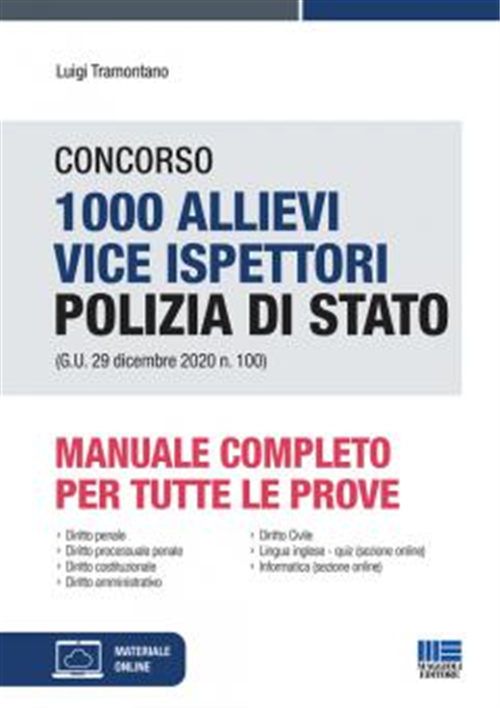 Il manuale è un utile strumento di preparazione a tutte le prove del concorso indetto dal Ministero dell'Interno per il reclutamento di 1.000 Allievi Vice Ispettori della Polizia di Stato (G.U. 29 dicembre 2020 n. 100). Il bando di concorso prevede di selezionare i candidati attraverso le seguenti prove: prova preselettiva (in caso di alto numero di candidature) consistente in quiz a risposta multipla sulle materie richieste dal bando; prove fisiche (corsa, salto in alto e sollevamenti alla sbarra); accertamenti psico-fisici con esame clinico generale, prove strumentali e di laboratorio; prove attitudinali con batterie di test collettivi e individuali e un colloquio; prova scritta consistente nella stesura di un elaborato su elementi di diritto penale ovvero di diritto processuale penale, con eventuali riferimenti al diritto costituzionale; prova orale sulle materie oggetto della prova scritta e sulle nozioni di diritto amministrativo, diritto civile, lingua straniera prescelta dal candidato e informatica. Il manuale presenta in maniera chiara e approfondita tutte le materie richieste dal bando: Diritto penale; Diritto processuale penale; Diritto costituzionale; Diritto amministrativo; Diritto Civile. Nella sezione online disponibile seguendo le istruzioni riportate in fondo al libro, saranno presenti anche le sezioni relative alla lingua inglese e alle competenze informatiche, utili per completare la preparazione dei candidati oltre ai futuri aggiornamenti normativi. Il testo è aggiornato agli ultimi provvedimenti legislativi (Decreto Cura Italia, Decreto Rilancio, Decreto Agosto, Decreto Semplificazioni, Decreto Sicurezza e immigrazione, Decreto Ristori), presentandosi, così, come uno strumento di sicura utilità per la preparazione del candidato.